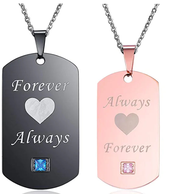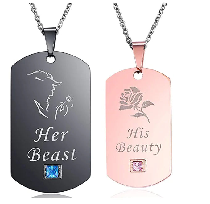 The male necklace features a striking design measuring 50*28MM, while the female counterpart is elegantly sized at 40*22MM. Both necklaces boast a sturdy thickness of 2.7MM and are complemented by a 60CM bead chain that adds a touch of sophistication. With a perimeter that ranges from 51cm to 80cm, these necklaces can be adjusted to ensure a comfortable fit.